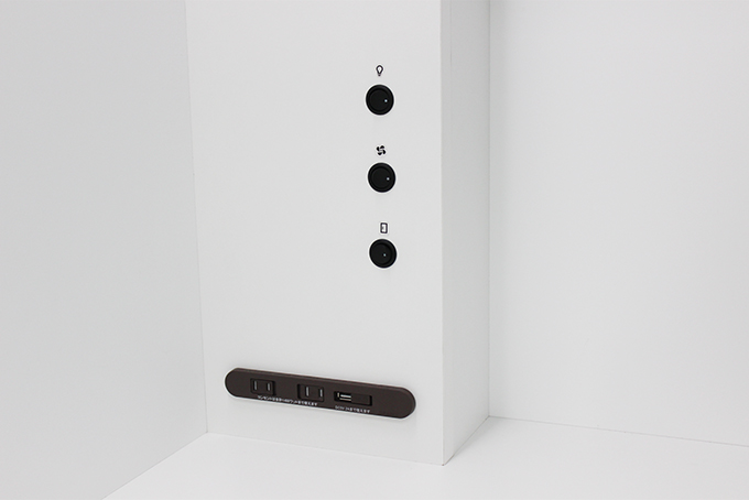 各種スイッチ。LED照明、換気ファン、プライベートドア、USB付コンセント(電源×2/USB給電×1)