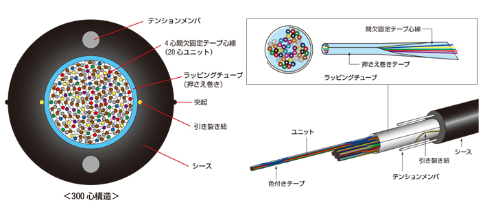 - SWRテープとWTC構造の最新光技術を利用し同じ心数のスロット型光ケーブルと比べて飛躍的に細径・軽量化を実現した光ケーブルです。