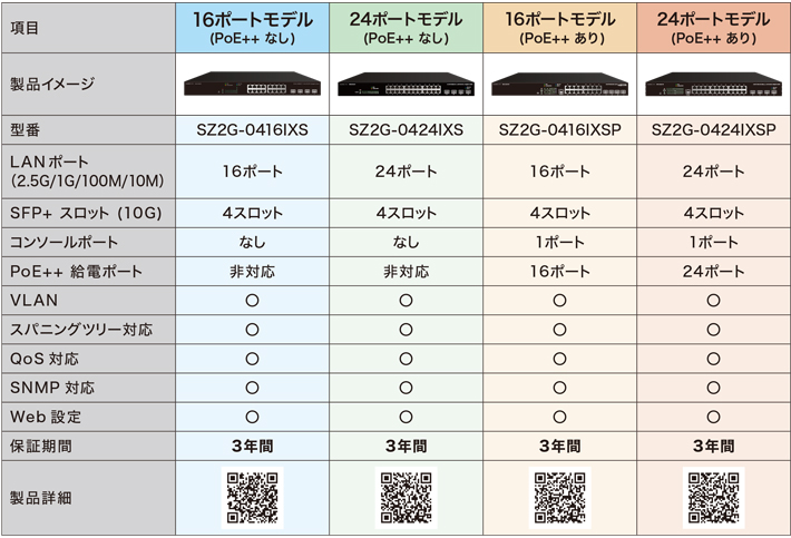 24ポート(もしくは16ポート)、PoE++(もしくはPoE++なし)を揃えたラインナップです。