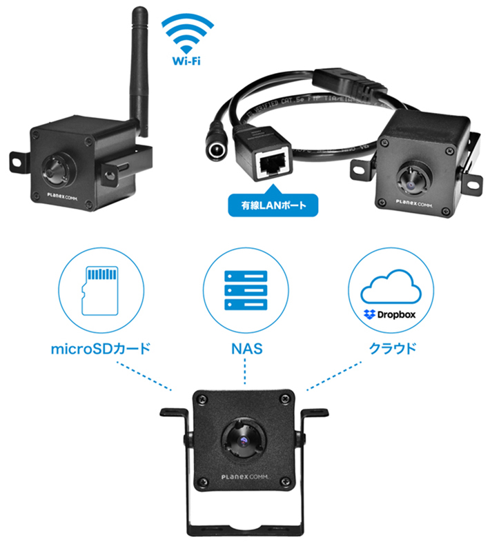 microSDメモリーカード(最大256GB)、NAS、クラウド録画(Dropbox)に対応。