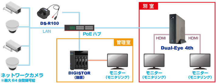 DIGISTOR の設置箇所と離れた場所で映像を確認したい場合、Dual-Eye 4thを設置することによって、PCレスで簡単にネットワークカメラの映像を確認することができます。Dual-Eye 4thから、DIGISTOR に保存されている録画データを再生することも可能です。また、録画データをダウンロード(バックアップ)することもできます。