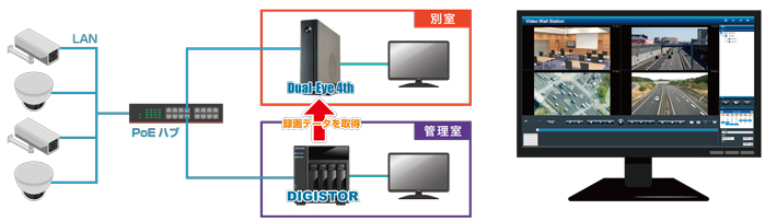 Dual-Eye 4th は録画機能のないモニタリング専用ユニットですが、弊社NVR「DIGISTOR」シリーズと連動させることで、その「DIGISTOR」の録画データを再生/バックアップすることができます。