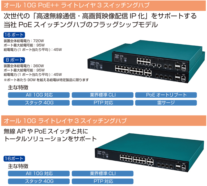 パナソニックのオール10G スイッチングハブ「XA-AMシリーズ」は、次世代の高速無線通信・高画質映像配信IP化をサポートする同社スイッチングハブのフラッグシップモデルです。