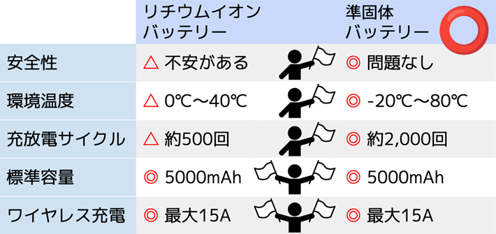 画期的な新技術の準固体電池は、従来のリチウムイオン電池と比べて、標準容量やワイヤレス充電の機能に遜色はありませんが、内部短絡や熱暴走のリスクが大幅に低減し飛躍的に向上した安全性と、充放電サイクル数も多いので、スマホ生活には欠かせないアイテムのモバイルバッテリーに最適です