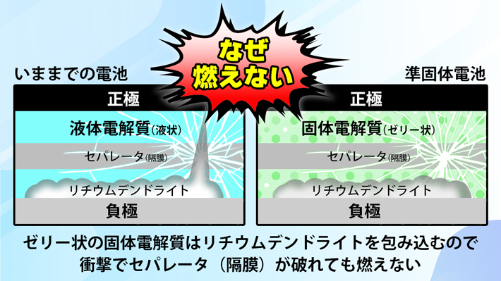 準固体電池なら燃えない固体電解質がリチウムデンドライトをゼリー状に包み込み、リチウムデンドライトの成長を抑制するため、発火や爆発が発生しません