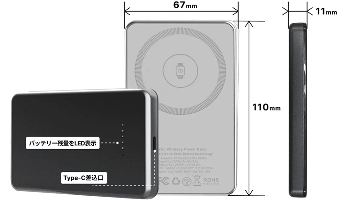 画期的な新技術の準固体電池は、従来のリチウムイオン電池と比べて、標準容量やワイヤレス充電の機能に遜色はありませんが、内部短絡や熱暴走のリスクが大幅に低減し飛躍的に向上した安全性と、充放電サイクル数も多いので、スマホ生活には欠かせないアイテムのモバイルバッテリーに最適です。