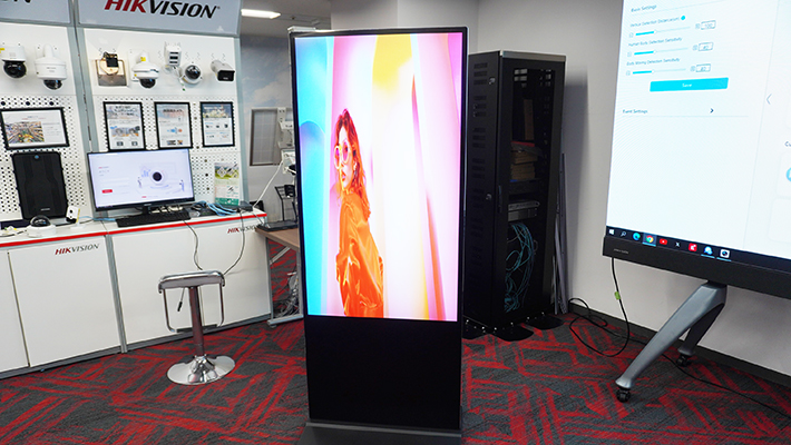 デジタルサイネージ ジャパン2025でも展示されたフロアスタンド型デジタルサイネージ(DS-D6055UN-D/S)。ネットワーク上で簡単にコンテンツ管理ができるサイネージソリューション